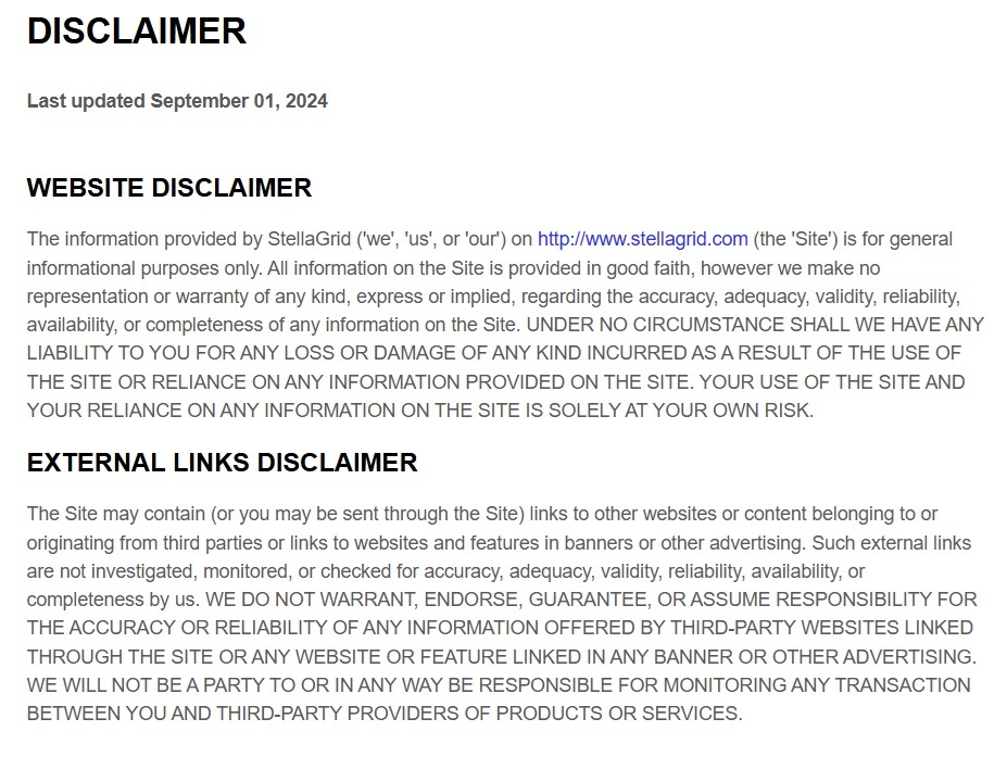 StellaGrid is not liable for any damages whatsoever arising out of or related to the use, inability to use or reliance upon the website or the use of its products.