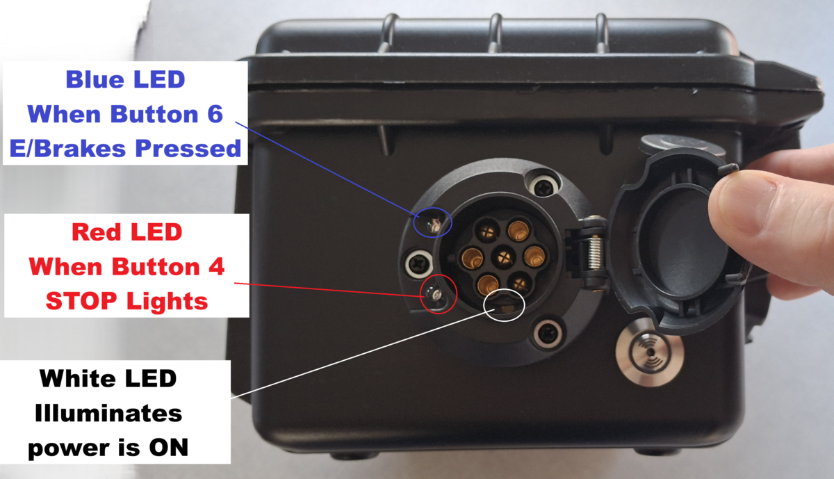 *There is on the large 7 pin round socket LED's that will illuminate to show the tester box is working. Also there is a BUZZER that sounds when pressing the Electric Brake button on the wireless remote.